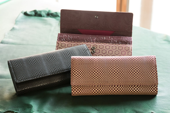 お客さまの要望から生まれた長財布は最近のヒット作。伝統的な素材を使いながら、ファッション性と機能を加味した。